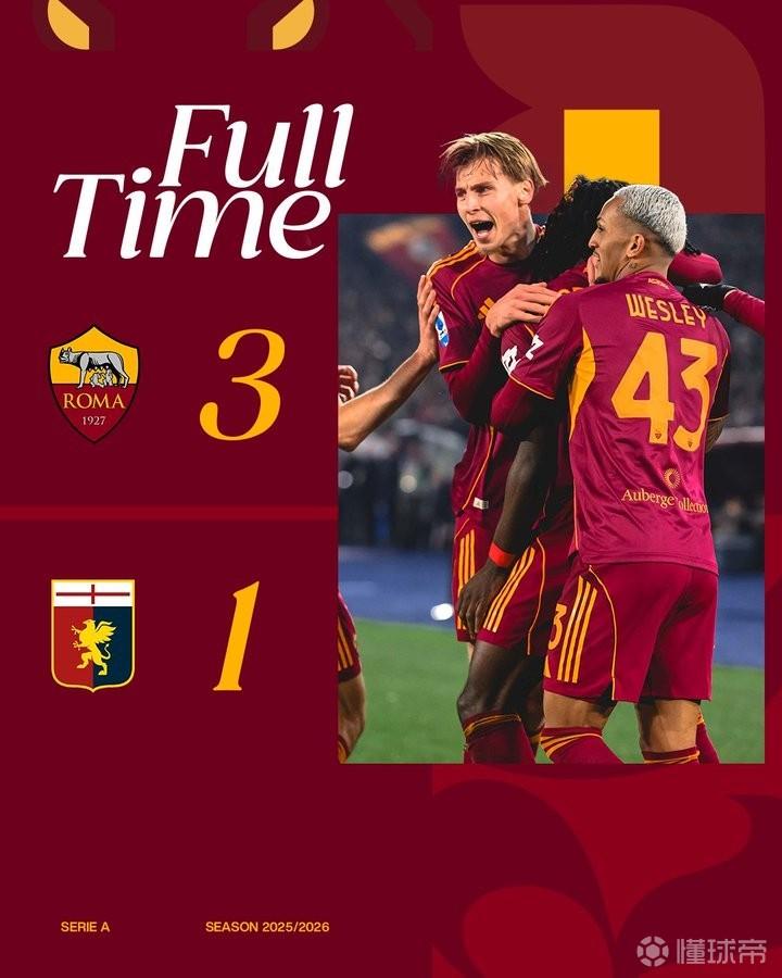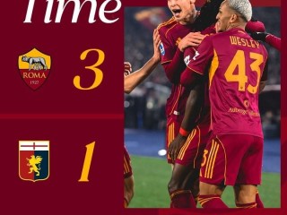 北京时间12月30日,在意甲第17轮的比赛中,罗马依靠马蒂亚斯-苏莱、夸迪奥-科内以及埃文-弗格森的进球主场3-1击败热那亚,排名重回积分榜第四位。