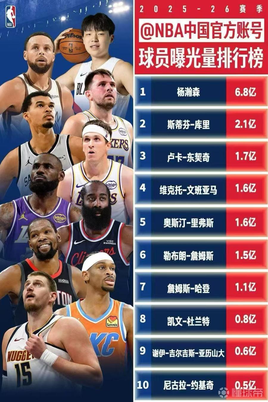 北京时间12月30日,NBA中国官方账号公布了一份2025-26赛季球员曝光量排行榜。根据NBA官方统计,在中国,球员曝光最高的是杨瀚森,其次是库里、东契奇。