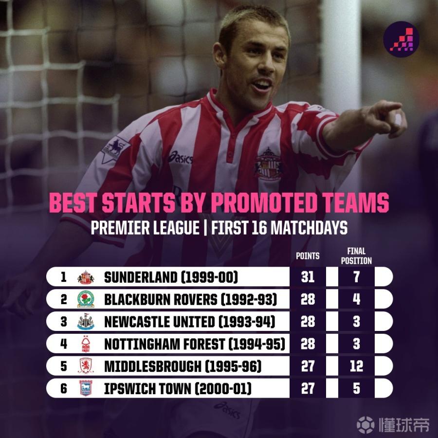 纵观英超历史,只有六支升班马曾在赛季前16轮比赛中拿到超过26分。其中五支都出现在世纪之交之前,最近的一次是2000-01赛季的伊普斯维奇——当时他们同期拿到27分,最终以联赛第五名收官。
