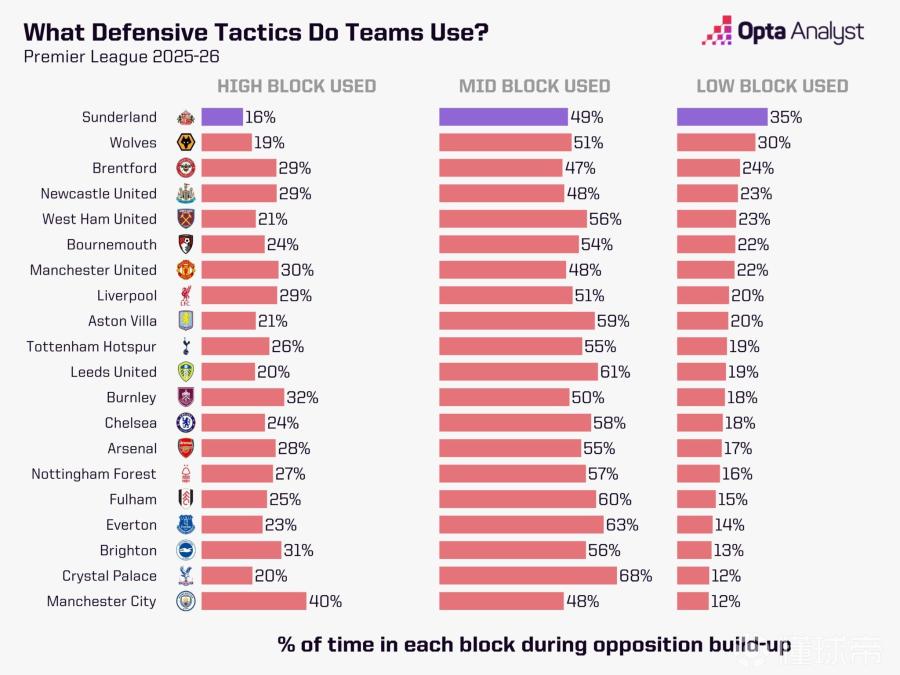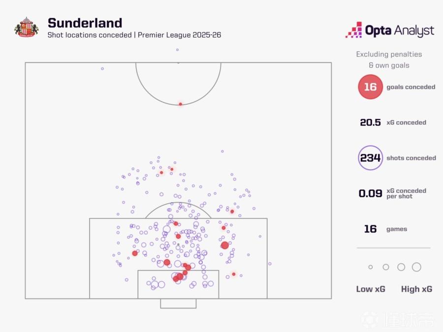 再次强调,这类比例数据本身偏低,并不必然意味着一支球队的防守体系就足够稳固,但当这些指标与其他防守数据结合来看时,显然都对桑德兰十分有利。