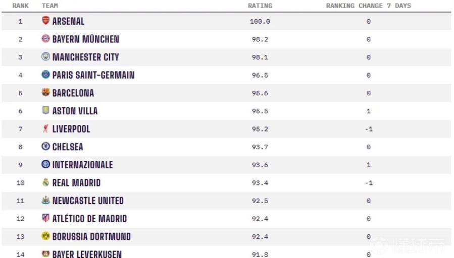 在男足排名中,阿森纳以100分位居第一。皇马目前的评分为93.4分,位列全球第十,在近期排名中有所下滑。