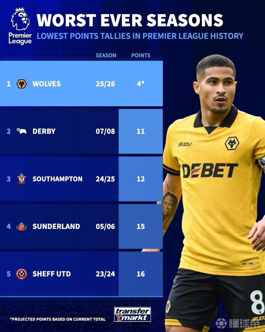 根据德转的估算,他们认为狼队本赛季最终赛季末得分仅有4分。而英超历史上单赛季最低分得主为德比郡在2007-08赛季创下的11分。