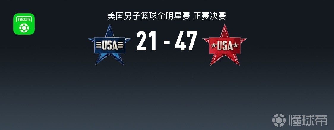 北京时间2月16日美国男子篮球全明星赛 正赛决赛,美国星条队对阵美国星辰队。开场美国星辰队迅速取得12-1开局,随着将分差拉大至20分以上,星条队无力反扑,最终美国星辰队47-21大胜星条队夺得全明星正赛冠军。