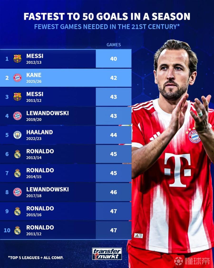 当凯恩的射门洞穿库尔图瓦的十指关时,一项尘封多年的纪录被正式改写。根据权威数据统计,本世纪五大联赛球员单赛季达成50球里程碑所用场次最少的排行如下: